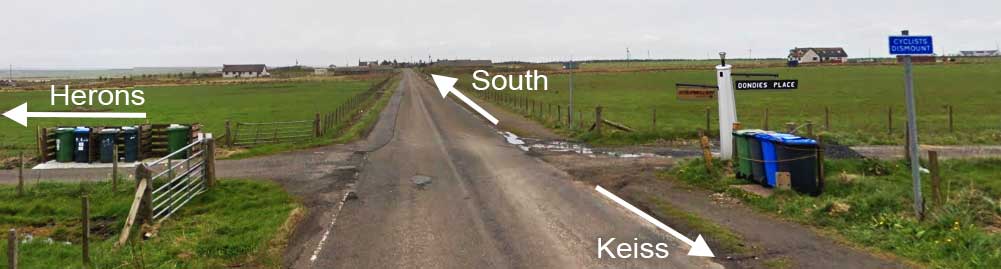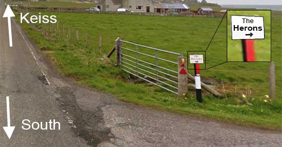 After approximately 8 miles, before you reach the village of Keiss, you will pass a sign saying "Keiss Beach". Sat Nav will probably bring you to this junction. Carry on a short distance beyond and take the next single track road on the right. There is a small sign at the entrance to the road, "The Herons" and a house sign opposite the turn that looks a bit like a lighthouse. The cottage is on the left at the end, as you face the sea. Go through the double gates into the drive.